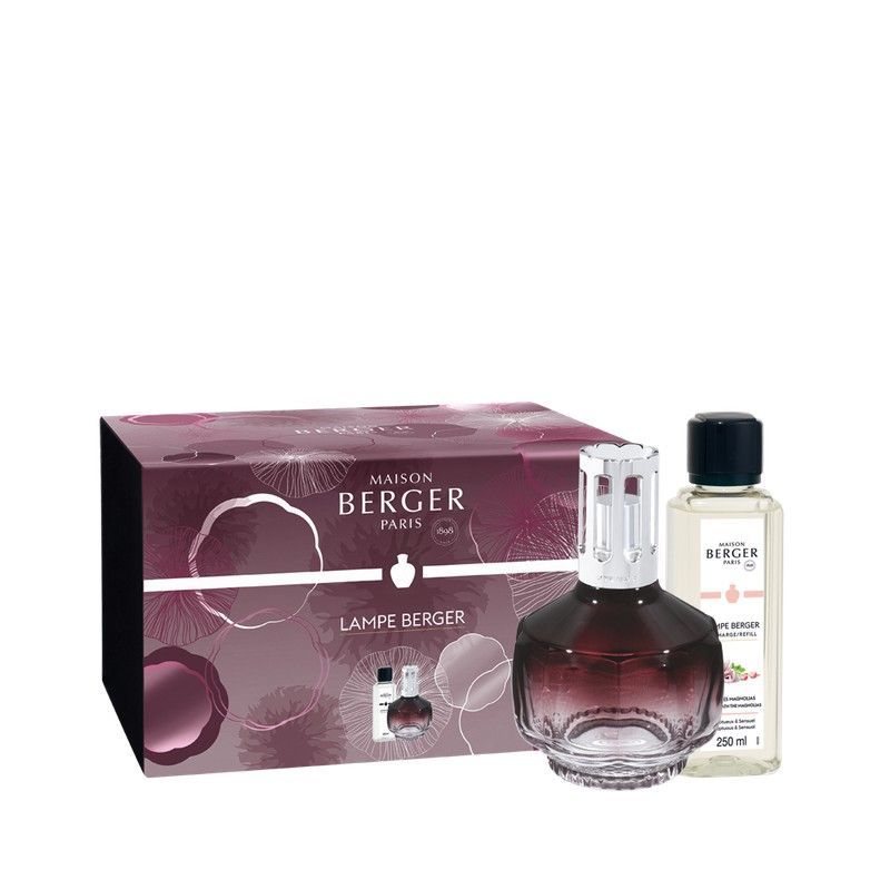 Lámpara catalítica Molecule Prune de Lampe Berger, ideal para perfumar espacios con elegancia. Incluye lámpara de vidrio morado con diseño facetado y frasco de aceite aromático. Regalo perfecto para amantes de la decoración y aromaterapia. Diseño sofisticado y funcional para cualquier hogar.