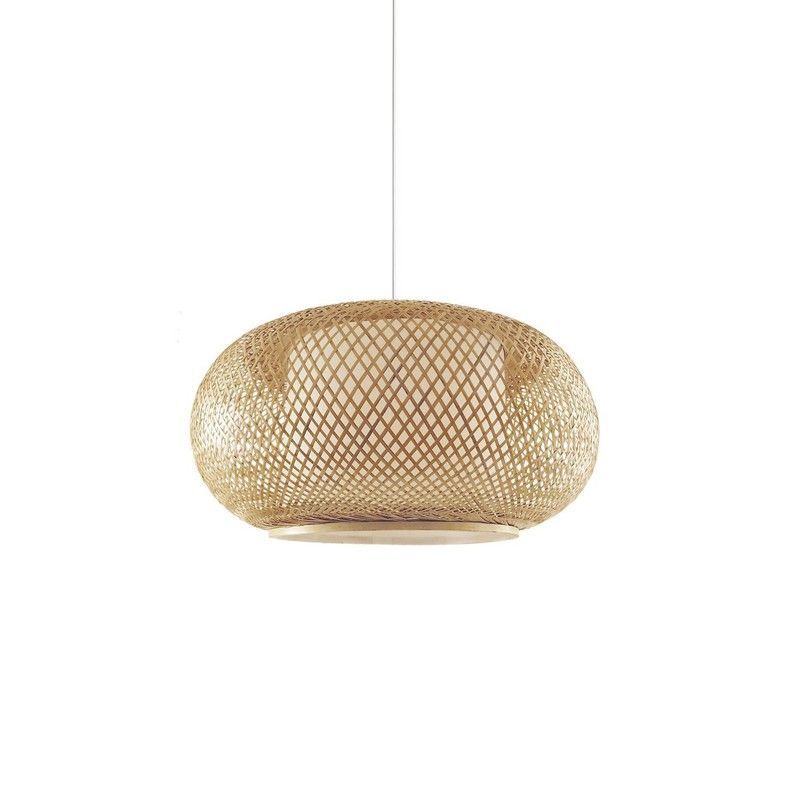 Lámpara colgante BREZO Lumiere con diseño ovalado y estructura tejida en ratán natural. Ideal para espacios con estilo rústico o bohemio, aporta calidez y luz ambiental. Fabricada con materiales naturales, perfecta para salones, comedores o terrazas. Su acabado dorado y textura única la convierten en un elemento decorativo destacado.