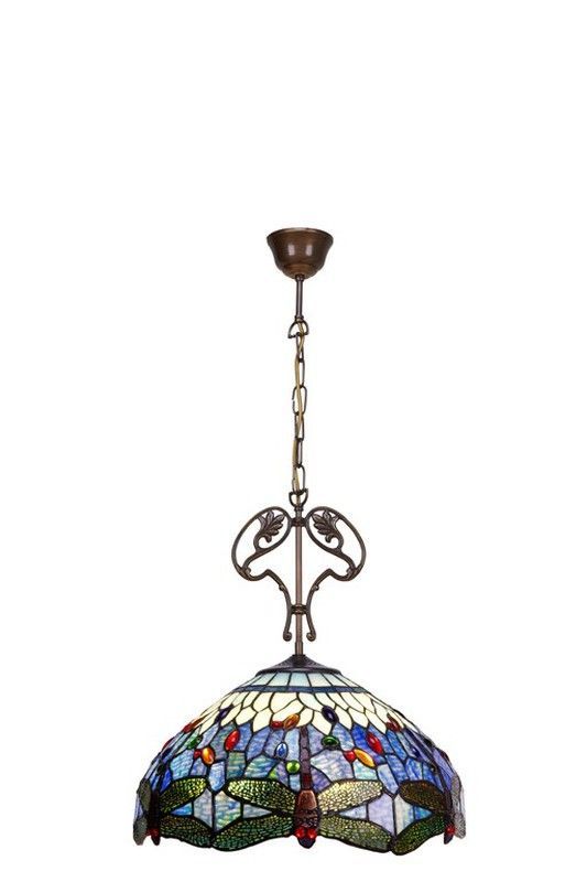 Lámpara colgante Tiffany de 40 cm con diseño Belle Époque, ideal para decorar salones, comedores o dormitorios. Fabricada con vidrio coloreado y metal acabado en bronce antiguo, presenta un estampado artístico con libélulas y hojas. Aporta un toque clásico y elegante a cualquier espacio. Perfecta para amantes del estilo vintage y decoración de lujo