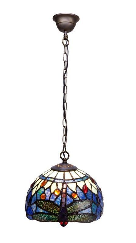 Lámpara colgante Tiffany Serie Belle Epoque con diseño artesanal de libélula en vidrio tallado. Ideal para decorar espacios como comedor, sala o dormitorio. Fabricada con vidrio de colores y estructura metálica de acabado oscuro. Diámetro 20 cm. Estilo clásico y elegante que aporta luz cálida y un toque vintage a tu hogar.