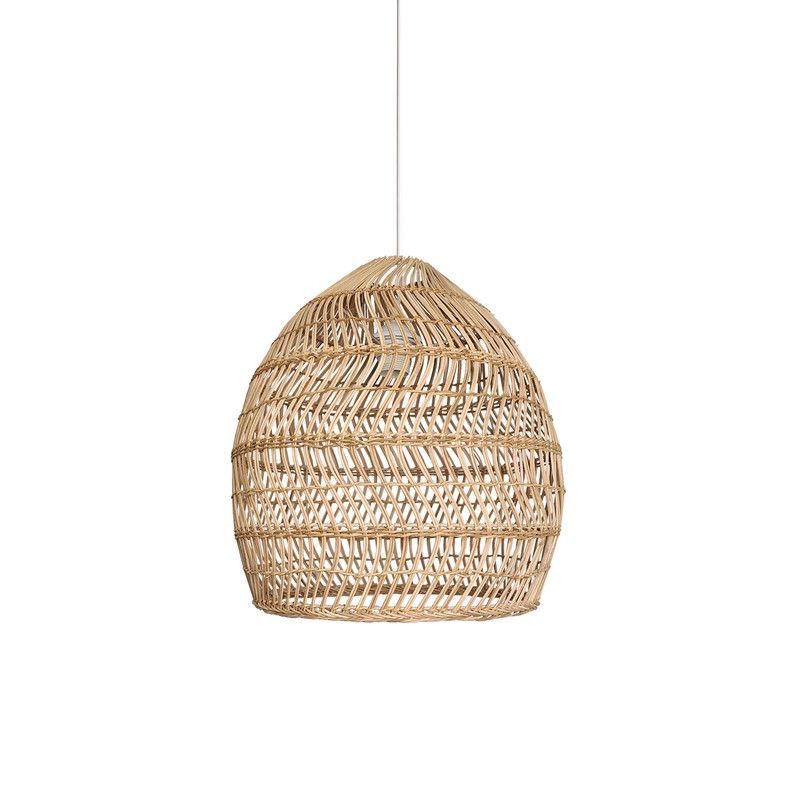 Lámpara colgante KOBE Lumiere de diseño rústico y elegante, fabricada en ratán natural. Ideal para espacios con estilo boho, escandinavo o tropical. Su estructura trenzada y forma campana aportan luz cálida y ambiental. Perfecta para salones, comedores o terrazas. Dimensiones: 40 cm de largo, 40 cm de ancho y 180 cm de alto.