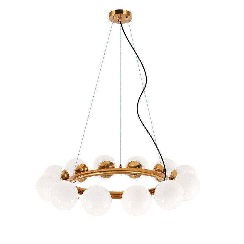 Lámpara colgante MD3198-GD Lumiere con diseño moderno y elegante, ideal para iluminar espacios como comedor, salón o cocina. Estructura circular en metal dorado con 12 esferas de vidrio opalino blanco que difuminan la luz suavemente. Combina estilo contemporáneo con funcionalidad, creando un ambiente cálido y sofisticado. Perfecta para interiores c