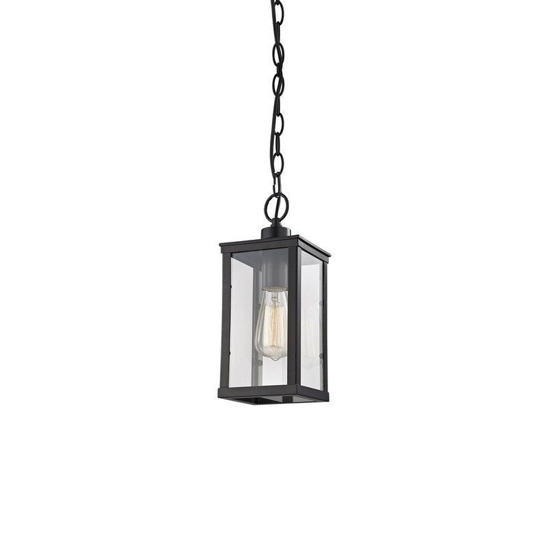 Lámpara colgante MD6212-BK Lumiere con estructura metálica en acabado negro y cristales transparentes. Diseño rectangular clásico con bombilla tipo filamento visible, ideal para iluminar porches, terrazas o espacios interiores con estilo rústico o industrial. Fácil instalación mediante cadena metálica. Calidad duradera y acabado elegante.