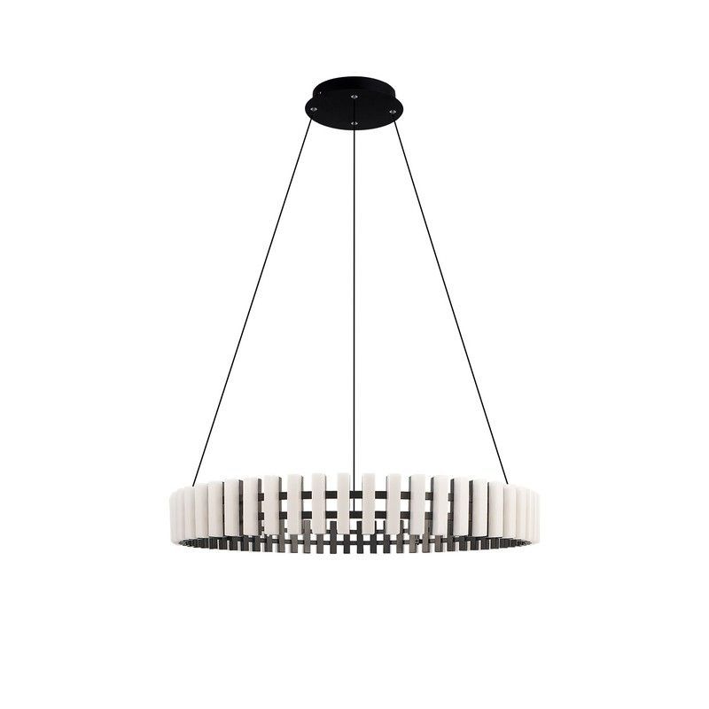 Lámpara colgante MD8242-600 Lumiere con diseño circular y listones blancos de madera, soporte negro y cables de suspensión. Estilo moderno y minimalista, perfecta para iluminar comedor, cocina o salón con un toque elegante y contemporáneo. Ideal para espacios que buscan luz funcional y diseño vanguardista.