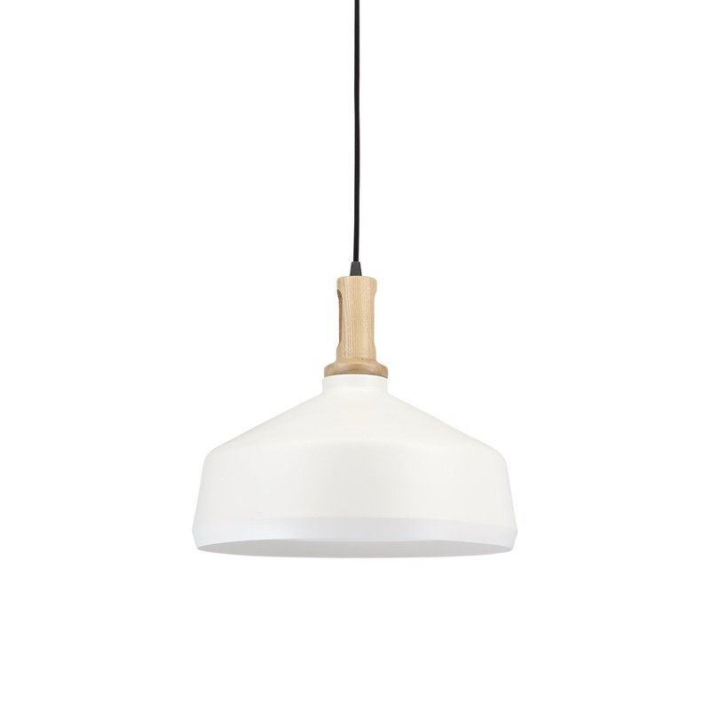 Lámpara colgante MD9094B-W Lumiere con diseño escandinavo y acabado minimalista. Cuerpo blanco mate y conector de madera natural, ideal para cocinas, comedor o espacios modernos. Cable negro delgado y fácil instalación. Aporta luz cálida y estilo a tu hogar.