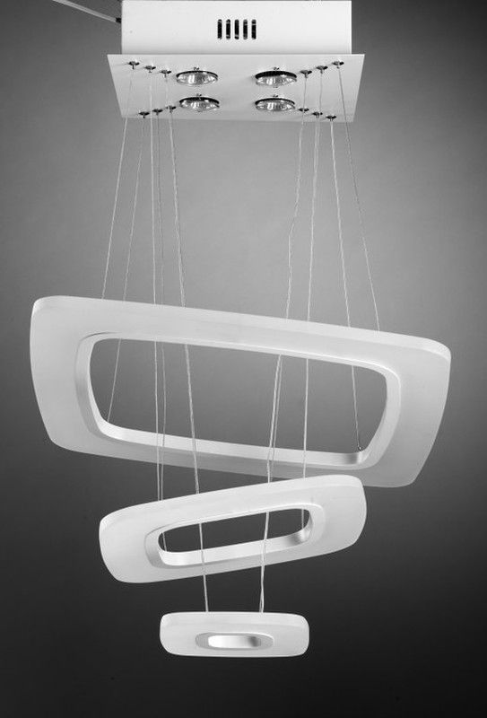 Lámpara colgante Serie Kevin Onli, diseño moderno y minimalista con tres anillos blancos suspendidos por cables finos. Ideal para salones, comedores o espacios de diseño contemporáneo. Fabricada con acero inoxidable y plástico de alta calidad, ofrece una iluminación ambiental sofisticada y elegante. Perfecta para crear un ambiente luminoso y estili