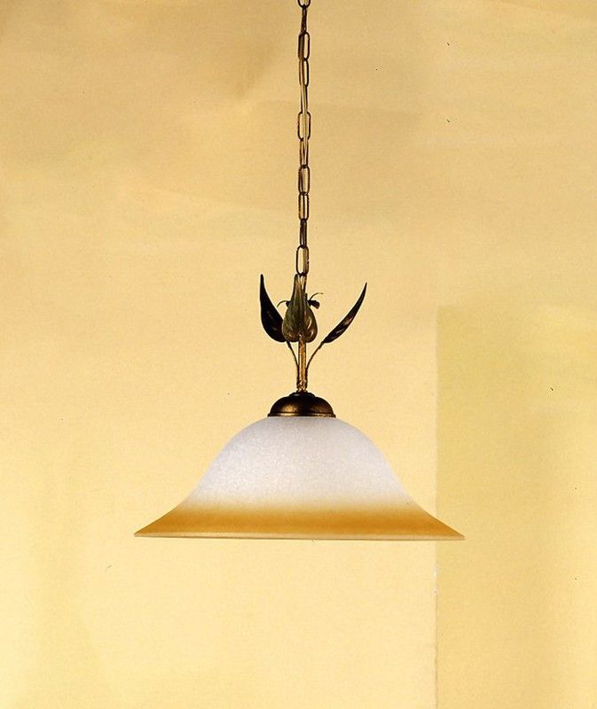 Lámpara colgante Serie Mira Onli con pantalla de vidrio opalino blanco y borde dorado, acabado metálico elegante y detalles decorativos en forma de hojas negras. Ideal para espacios como comedor, cocina o pasillo, aporta un toque clásico y sofisticado. Diseño duradero y fácil de instalar.