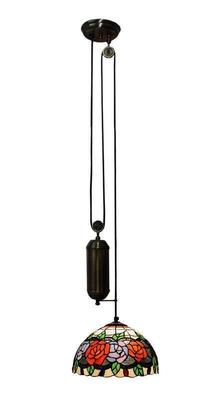 Lámpara colgante Tiffany de techo con sistema de poleas para ajustar altura, ideal para cocinas, comedor o salón. Diseño artesanal con pantalla de vidrio tallado en tonos rojos, blancos y verdes con motivos florales. Estructura metálica en acabado oscuro. Aporta estilo vintage y elegancia a cualquier espacio.