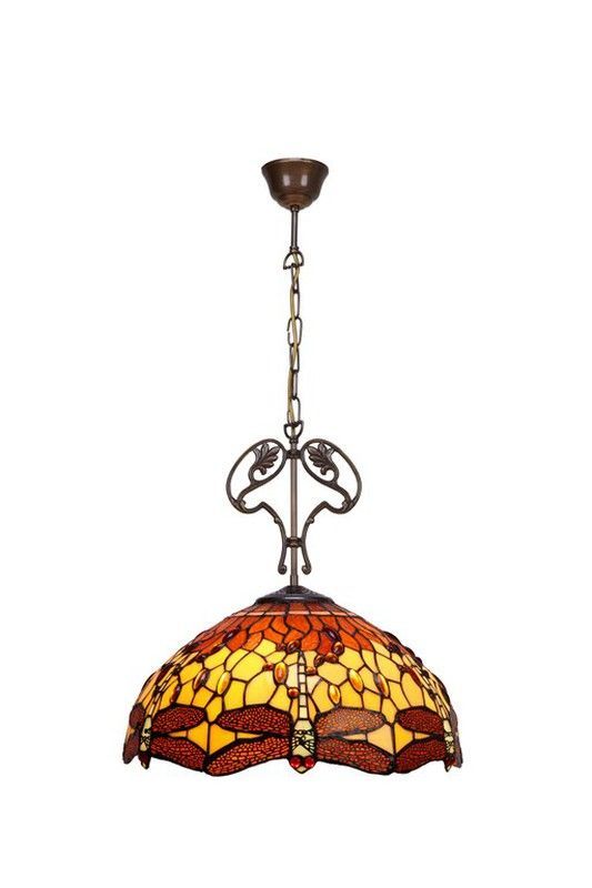 Lámpara colgante Tiffany Serie Belle Amber, con pantalla de vidrio tallado en tonos cálidos y diseño de libélula. Ideal para decorar espacios como comedor, sala o entrada. Fabricada con vidrio y metal de alta calidad, ofrece un estilo clásico y elegante. Diámetro de 41 cm. Perfecta para crear una atmósfera acogedora y sofisticada.