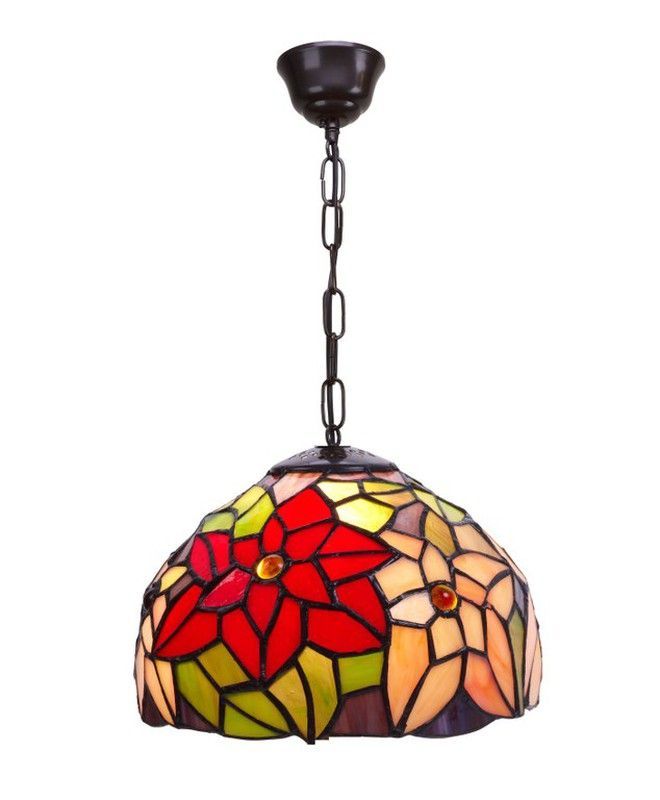Lámpara colgante Tiffany Serie Güell con diseño floral en vidrio tallado, ideal para decorar espacios como comedor, sala o dormitorio. Con diámetro de 30 cm, combina colores vibrantes como rojo, verde y amarillo en un estilo artesanal. Estructura metálica en acabado oscuro y cadena de suspensión. Aporta un toque clásico y elegante a tu hogar.