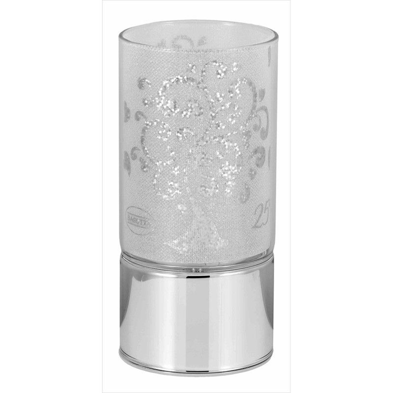 Lámpara conmemorativa de 15 cm con diseño del Árbol de la Vida, ideal para celebrar 25 años. Fabricada en vidrio texturizado con efecto brillante y base metálica cromada. Su diseño elegante y sofisticado la convierte en un regalo perfecto para aniversarios, bodas o eventos especiales. Combina estilo y simbolismo en un objeto decorativo de alta cali