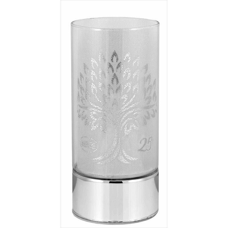 Lámpara conmemorativa de 20 cm con diseño del Árbol de la Vida, ideal para celebrar 25 años. Fabricada en vidrio transparente con grabado elegante y base metálica cromada. Perfecta como regalo simbólico para aniversarios, bodas o eventos especiales. Combina estilo y significado en un objeto decorativo de alta calidad.
