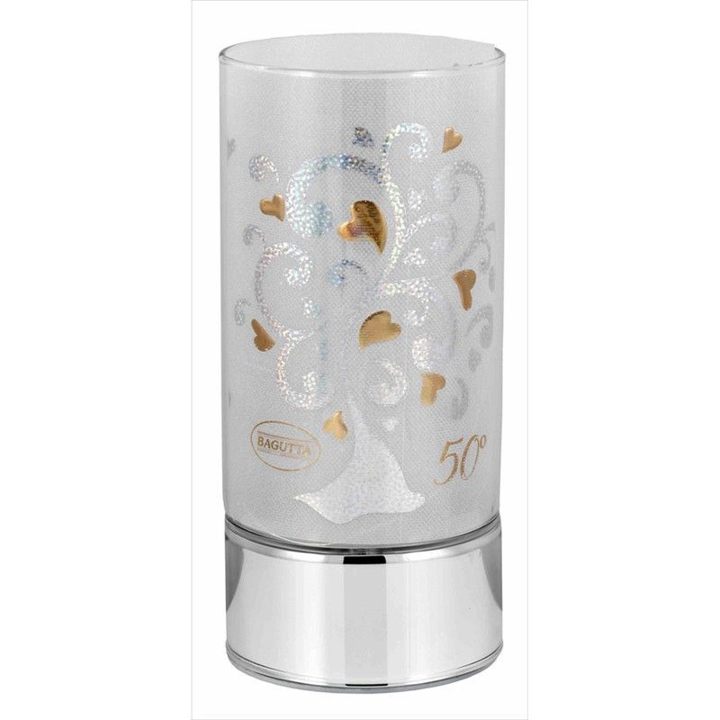 Lámpara conmemorativa de 20 cm con diseño del Árbol de la Vida, ideal para celebrar 50 años. Fabricada en vidrio con detalles dorados y base metálica brillante. Perfecta como regalo para aniversarios o eventos especiales. Diseño elegante y sofisticado que combina elementos florales y corazones en tonos plateados y dorados.