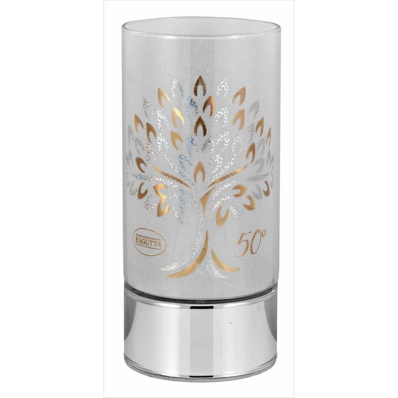 Lámpara conmemorativa de 20 cm con diseño del Árbol de la Vida en tonos dorados y plateados, ideal para celebrar 50 años. Fabricada en vidrio texturizado y base metálica brillante, combina elegancia y simbolismo. Perfecta como regalo para aniversarios o eventos especiales. Diseño sofisticado y duradero para decorar cualquier espacio con un toque de