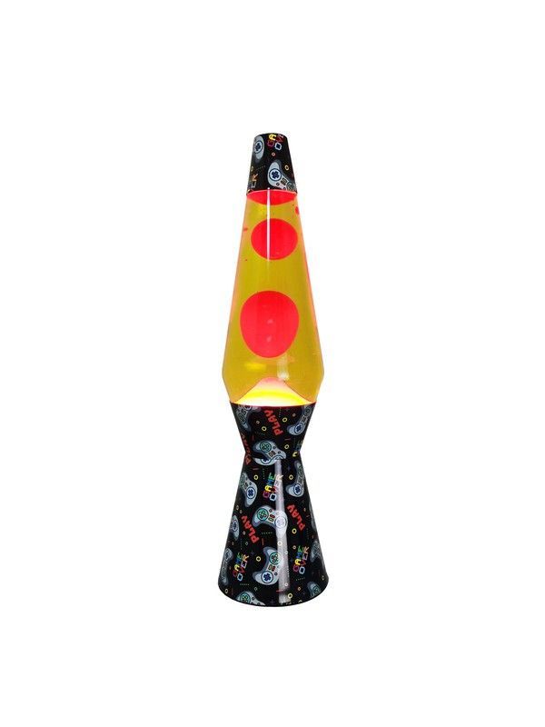 Lámpara de lava de 36 cm con diseño temático 'Let's Play', ideal para decorar espacios con estilo retro y gaming. Con líquido amarillo y burbujas rojas que flotan suavemente, su base y tapa presentan un estampado divertido con personajes de videojuegos. Fabricada en vidrio y plástico, es perfecta para ambientar habitaciones, salas o rincones de oci