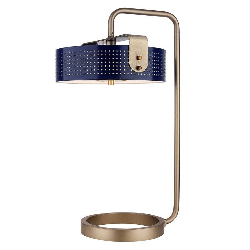 Lámpara de mesa Tuline con diseño moderno y elegante, ideal para decorar mesas de noche, escritorios o salones. Fabricada en metal con acabado dorado y pantalla azul perforada que difunde una luz cálida y ambiental. Perfecta para crear un ambiente sofisticado y acogedor en cualquier espacio de tu hogar.