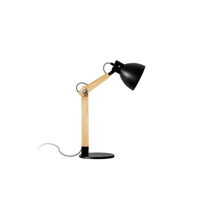 Lámpara de sobremesa DAPHNE Lumiere con diseño moderno y funcional. Estructura articulada en madera clara y pantalla en metal negro, ideal para escritorios, mesas de estudio o trabajo. Base circular estable y cable gris. Perfecta para iluminar espacios con estilo y comodidad.
