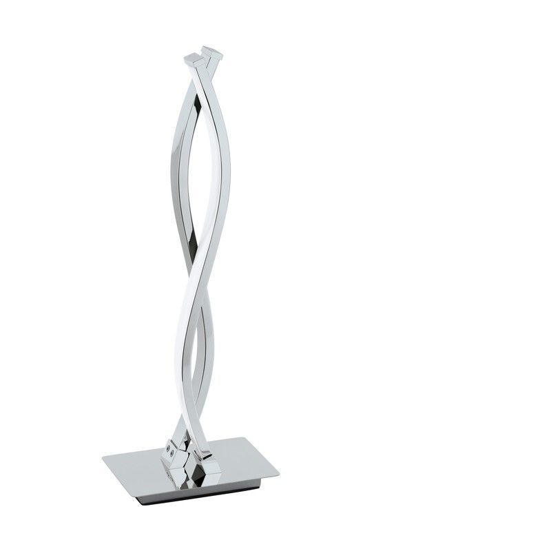 Lámpara de sobremesa Lasana 2 cromo con diseño espiralado y acabado plateado. Fabricada en acero inoxidable, ofrece un estilo moderno y sofisticado para cualquier espacio. Ideal para mesas de noche, escritorios o salones. Su base cuadrada y estructura elegante aportan un toque de lujo a tu hogar.