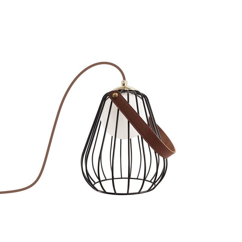 Lámpara de sobremesa MT2211-BK Lumiere con diseño industrial y elegante. Estructura metálica en forma de jaula con acabado negro mate y asas de cuero marrón. Ideal para decorar mesas, escritorios o rincones de estilo escandinavo o loft. Con bombilla blanca visible, aporta luz cálida y estilo único. Dimensiones: 18 cm de largo, 18 cm de ancho y 23 c