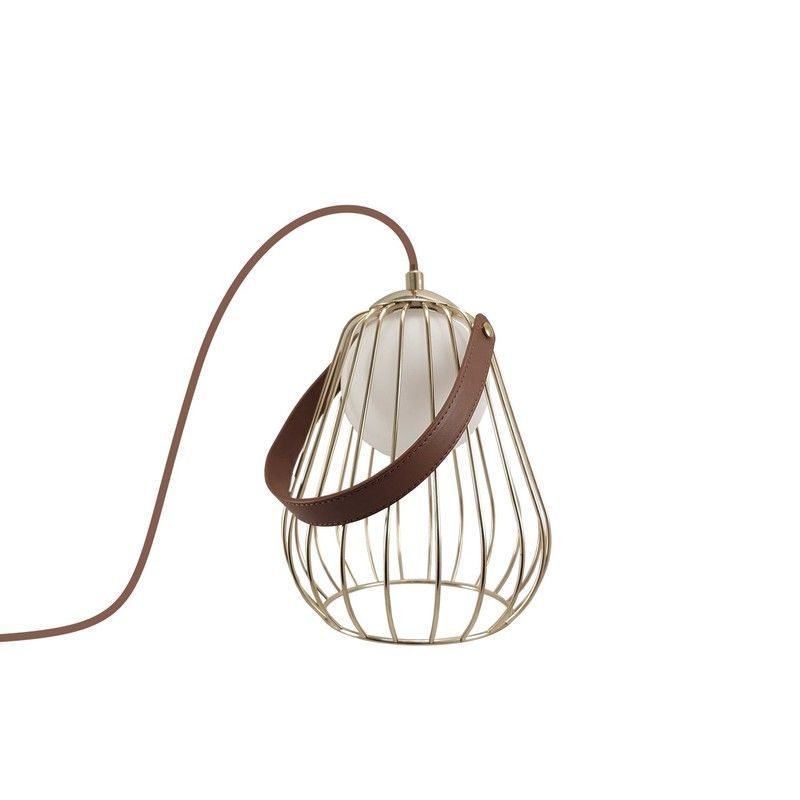Lámpara de sobremesa MT2211-GD Lumiere con diseño elegante y moderno. Estructura metálica dorada en forma de jaula, detalles en cuero marrón y difusor blanco para una luz cálida y ambiental. Ideal para mesas de noche, escritorios o rincones decorativos. Combina estilo industrial con toques sofisticados para cualquier espacio.