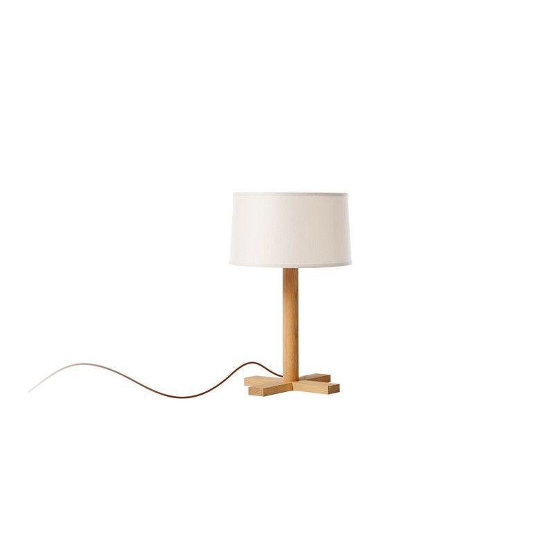 Lámpara de sobremesa YASMINA con base de madera natural y pantalla de textil blanco. Diseño minimalista y elegante, ideal para mesitas de noche, escritorios o rincones de lectura. Combina funcionalidad y estilo en espacios modernos. Dimensiones: 37 cm de largo, 37 cm de ancho y 61,5 cm de alto.
