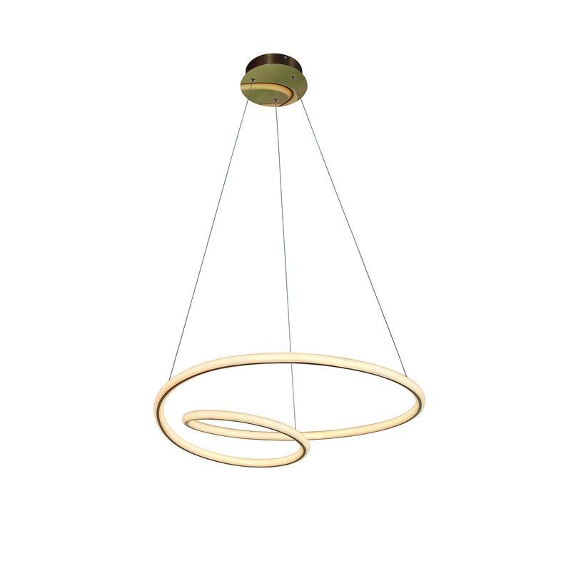 Lámpara de techo de diseño moderno con acabado dorado, fabricada en metal. Ideal para espacios como salones, comedor o cocinas. Su estructura de dos anillos entrelazados y luz LED integrada aporta un toque elegante y contemporáneo. Fácil instalación y perfecta para iluminar ambientes con estilo.