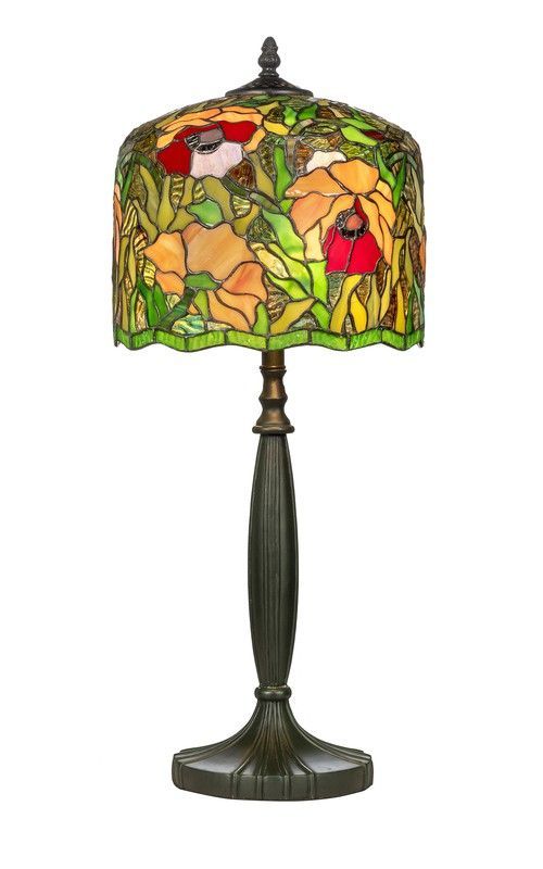 Lámpara de Tiffany mediana con pantalla de vidrio tallado en diseño floral, ideal para decorar salones, dormitorios o rincones con estilo clásico. Fabricada con vidrio de colores y base de metal acabado en verde oscuro, aporta un toque artístico y cálido a cualquier espacio. Perfecta para amantes del diseño vintage y la iluminación ambiental.