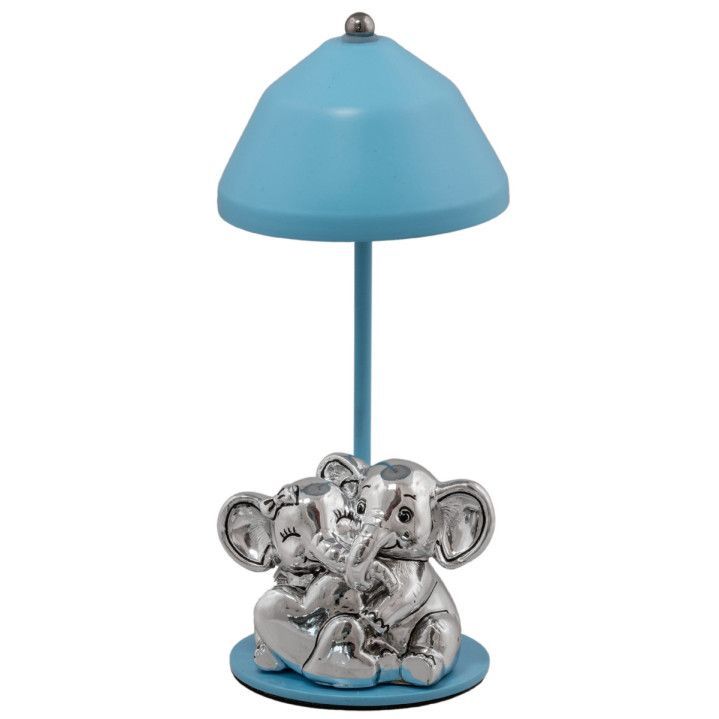 Lámpara decorativa de 22 cm con diseño de elefantes en acabado plateado y pantalla celeste. Ideal para iluminación ambiental en dormitorios, salas o espacios infantiles. Fabricada en plástico y metal, con carga USB para mayor comodidad. Un toque de estilo y calidez para tu hogar.