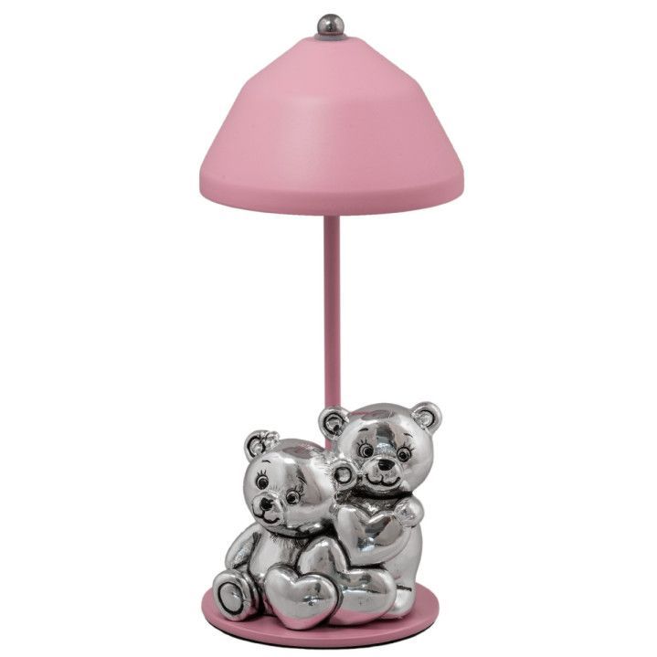 Lámpara de mesa decorativa con diseño de dos osos plateados bajo una pantalla rosa en forma de sombrilla. Fabricada en plástico y metal, ideal para iluminar espacios infantiles, dormitorios o como detalle decorativo. Con carga USB, fácil de usar y con un toque dulce y acogedor. Perfecta para regalar o ambientar cualquier rincón con estilo.