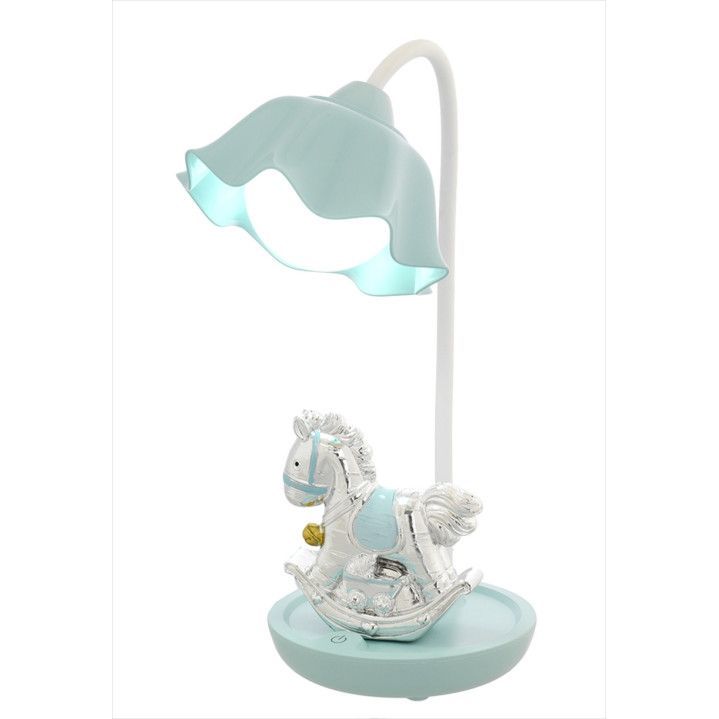 Lámpara de caballo de plástico celeste con carga USB, ideal para iluminar tu habitación de manera elegante y práctica.