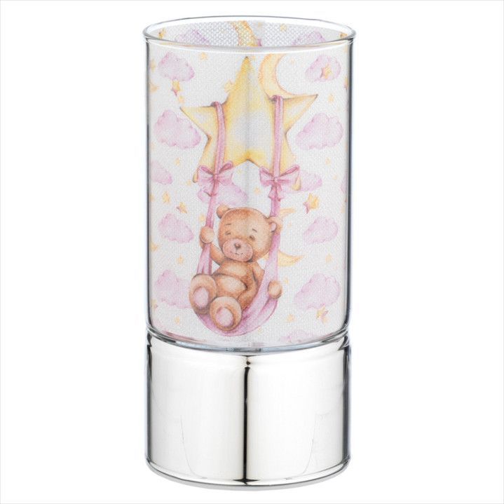 Lámpara decorativa con diseño infantil de oso en columpio, ideal para habitaciones de niños. Con estrellas, lunas y nubes en tonos rosas y dorados, crea un ambiente cálido y acogedor. Base metálica plateada y acabado acuarela suave. Perfecta como luz nocturna o ambiental para dormitorios infantiles.