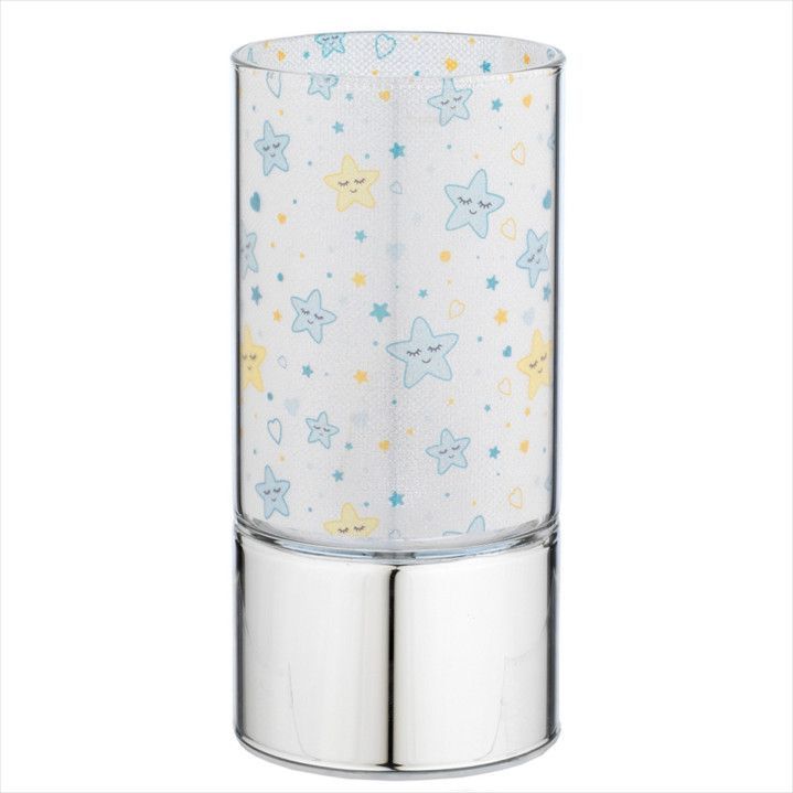 Lámpara nocturna de plástico con diseño infantil de estrellas celestes y amarillas con caritas sonrientes. Ideal para habitaciones de niños, crea un ambiente cálido y acogedor. Base metálica plateada y cuerpo transparente con estampado decorativo. Perfecta para acompañar el sueño de los más pequeños con luz suave y agradable.