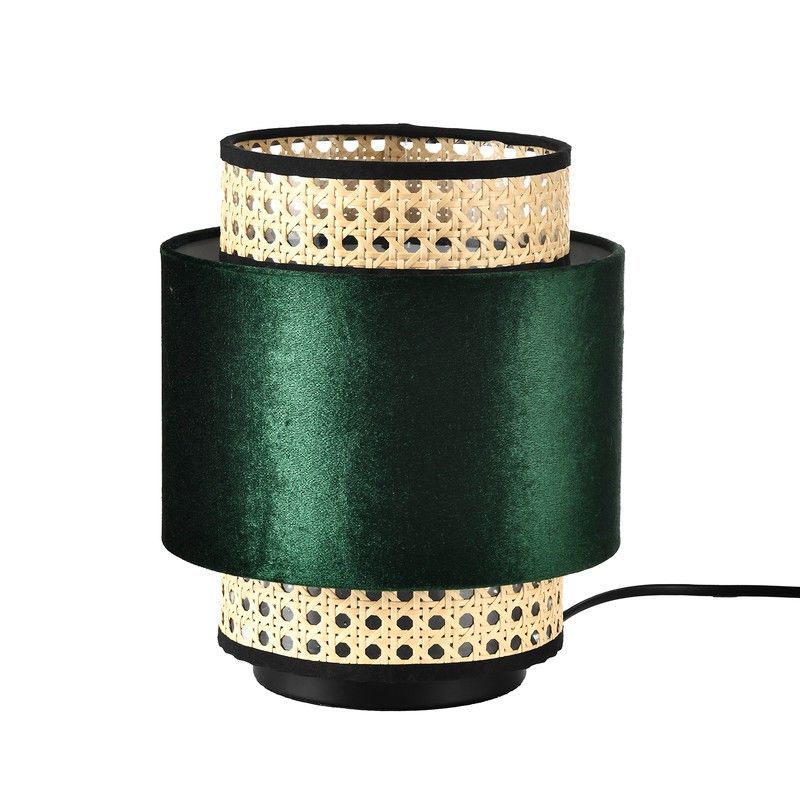 Lámpara de mesa Serie Vienna con diseño elegante y sofisticado. Cuerpo en terciopelo verde oscuro combinado con detalles en madera perforada en beige, ideal para decorar salones, dormitorios o espacios de lectura. Aporta un toque de estilo escandinavo y calidez a tu hogar. Fácil de usar y perfecta para crear ambientes acogedores.