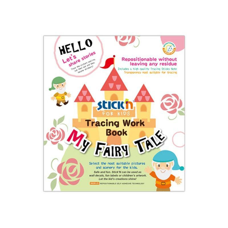 Libro de actividades 'My Fairy Tale' para niños, con trazado y pegatinas reutilizables sin dejar residuo. Ideal para fomentar la creatividad y el desarrollo motor. Incluye hojas de trazado de alta calidad y diseño encantador con castillos, enanos y rosas. Perfecto para niños que disfrutan de cuentos de hadas y manualidades.