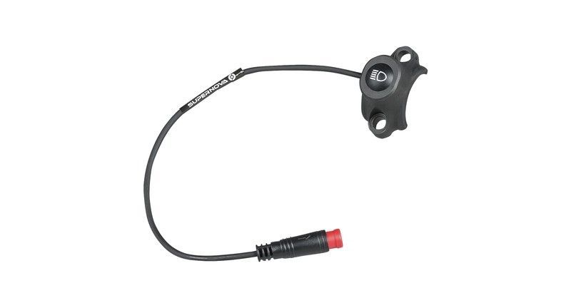 Interruptor para luz de bicicleta Supernova M99, ideal para ciclistas que buscan control fácil del haz alto. Fabricado en plástico y metal, con conector rojo y cable flexible. Diseño compacto y resistente, perfecto para montar en manillar y activar el faro con un solo toque. Incluye soporte de fijación seguro.