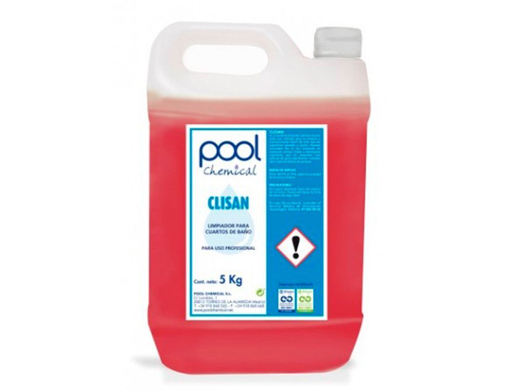 Limpiador profesional para cuartos de baño CLISAN, en garrafa de 5 kg. Fórmula antical eficaz para eliminar suciedad y residuos de agua dura. Ideal para uso en hoteles, centros comerciales y espacios comerciales. Producto de alta concentración, fácil de diluir y aplicar. Con etiquetado claro y advertencias de seguridad. Solución confiable para mant
