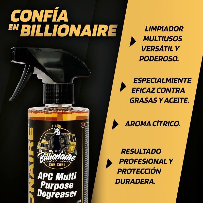 Limpiador multiusos para motor Billionaire de 500 ml, especialmente eficaz contra grasas y aceite. Con aroma cítrico y resultado profesional, ofrece protección duradera. Ideal para mantenimiento de vehículos y superficies industriales. Fórmula versátil y poderosa para una limpieza profunda y rápida.