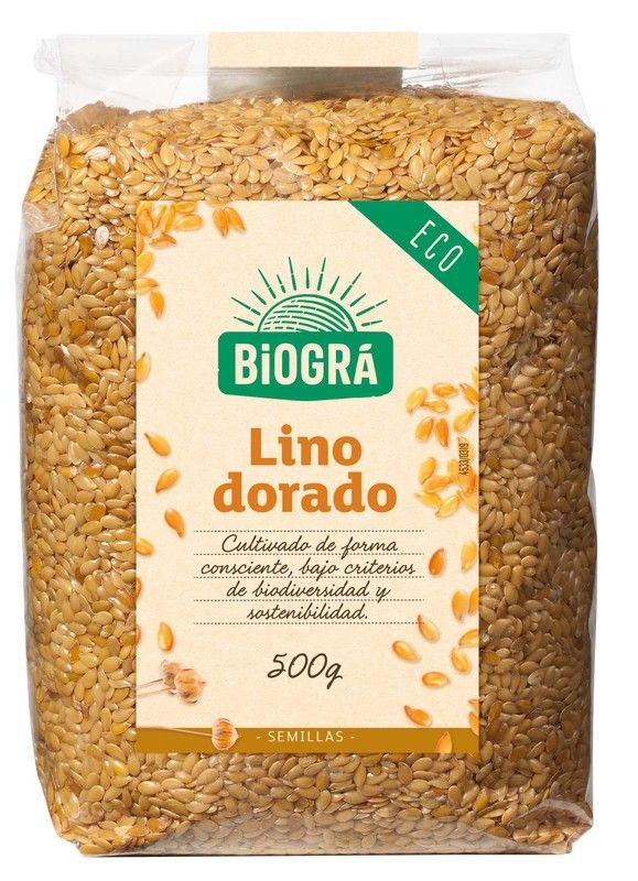 Semillas de lino dorado ecológicas Biográ, 500g. Cultivadas con criterios de biodiversidad y sostenibilidad. Ideal para enriquecer ensaladas, batidos o panes. Producto natural y saludable, perfecto para dietas conscientes y vegetarianas. Envase transparente que muestra la calidad de las semillas.