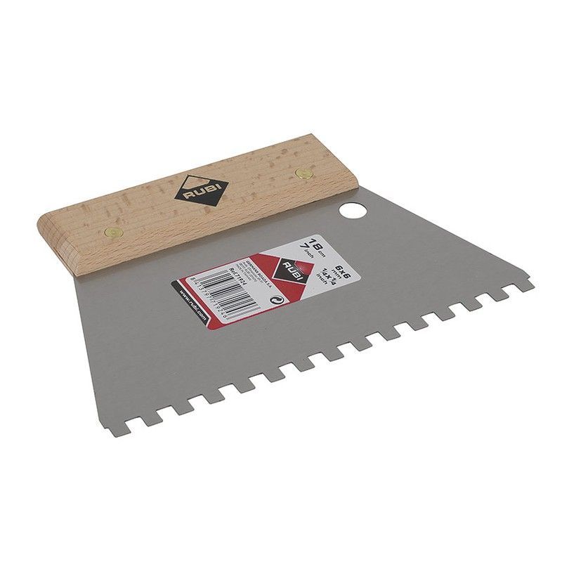 Llana peine dentada Rubí de 18 cm con dientes de 6x6 mm, fabricada en acero inoxidable y mango de madera. Ideal para aplicar mortero, cemento o adhesivos en trabajos de albañilería y reformas. Su diseño ergonómico facilita la distribución uniforme del material. Perfecta para profesionales y bricolaje.