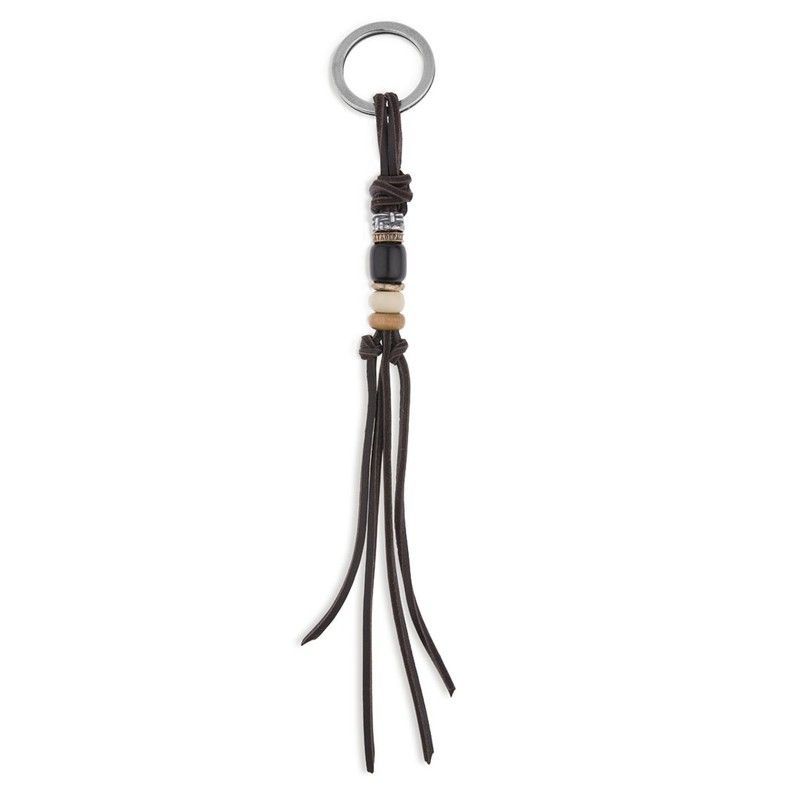 Llavero MK001X con diseño elegante y sofisticado, ideal para adultos que buscan un toque de estilo en sus accesorios. Fabricado con cuero negro de alta calidad y detalles metálicos plateados, incluye cuentas decorativas y una borla trenzada. Perfecto para complementar llaves, bolsos o mochilas con un aire bohemio y moderno.