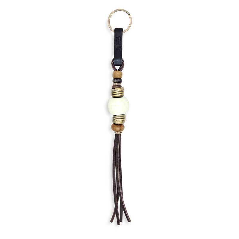 Llavero unisex de cuero marrón con diseño elegante y bohemio, ideal para hombres y mujeres. Fabricado con cuerda de cuero, perla blanca, detalles metálicos dorados y bolas de madera. Perfecto como accesorio para bolsos, llaves o mochilas. Estilo sofisticado y versátil para cualquier ocasión.