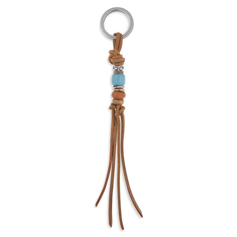 Llavero WK004X para mujer con diseño elegante y bohemio. Fabricado en cuero marrón con flecos, anillo metálico plateado y perla azul turquesa. Ideal para decorar llaves, bolsos o mochilas. Un accesorio versátil y sofisticado que combina estilo y funcionalidad.