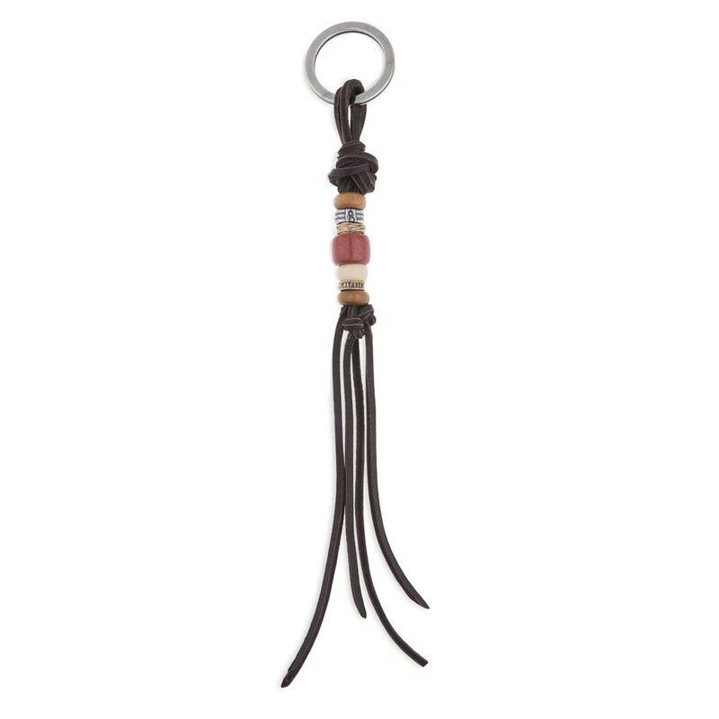 Llavero PLATA DE PALO MK003X con diseño bohemio y artesanal, ideal para adultos que buscan un toque de estilo. Fabricado con cuero negro trenzado, cuentas de resina en tonos rojo, blanco y marrón, y un anillo metálico plateado. Perfecto para decorar llaves, bolsos o mochilas con un aire sofisticado y natural.