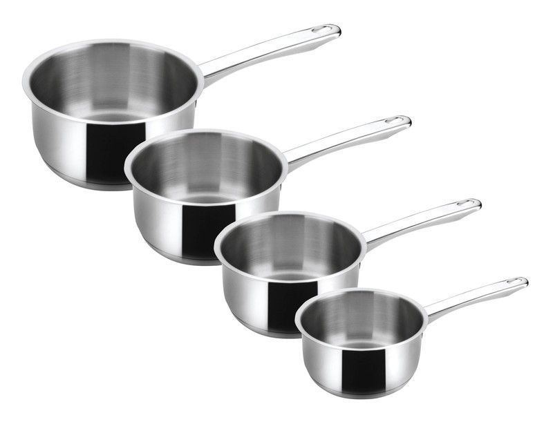 Lote de 4 cazos Basic Lacor en acero inoxidable, ideales para cocinar salsas, sopas y guisos con precisión. Con acabado brillante y banda negra decorativa, son resistentes y fáciles de limpiar. Perfectos para cualquier cocina, este juego es un regalo práctico y elegante para amantes de la cocina.