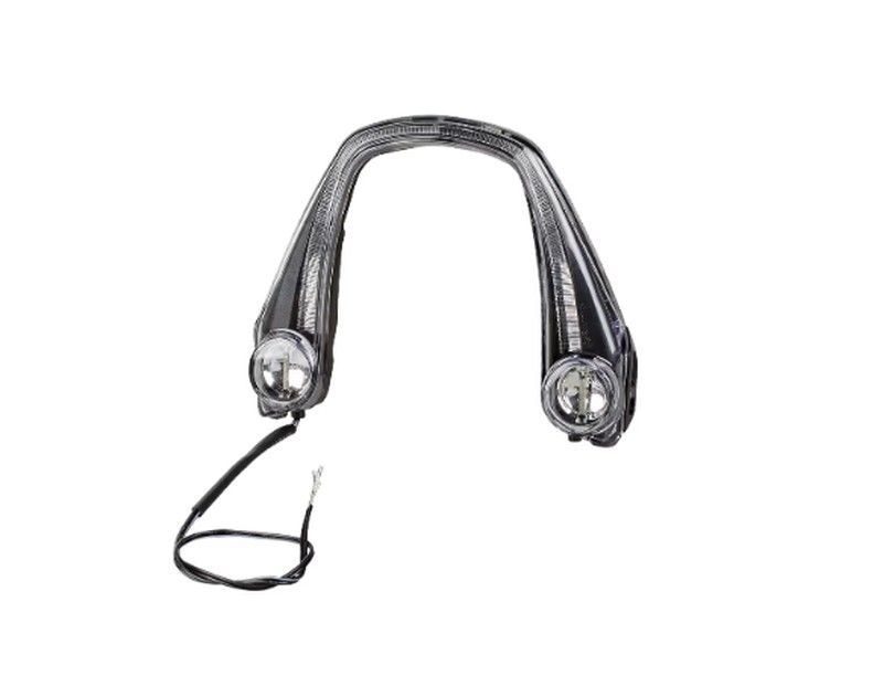 Luz Bontrager Forklight 2020 Ride+ para bicicleta, con diseño arqueado y dos luces LED en los extremos. Fabricada en plástico y metal, ofrece visibilidad y seguridad en rutas nocturnas o con poca luz. Ideal para ciclistas que buscan un accesorio funcional y resistente. Fácil instalación y conexión directa.