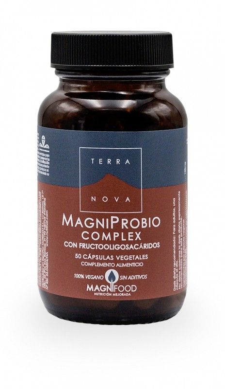 Magniprobio Complex con Fructooligosacáridos, un complemento alimenticio en 50 cápsulas vegetales de la marca Terra Nova. 100% vegano y sin aditivos, ideal para quienes buscan apoyar su salud intestinal de forma natural. Envasado en bote de vidrio oscuro para proteger la calidad del producto. Perfecto para adultos que cuidan su nutrición y bienesta