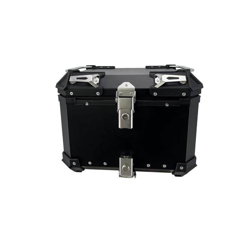 Maleta de aluminio GPR Tech de 26 litros, ideal para motocicletas. Diseño robusto y resistente con cierre central de acero inoxidable y pestillos laterales. Acabado negro mate con detalles plateados. Perfecta para almacenar equipaje de forma segura y protegida durante tus viajes en moto.