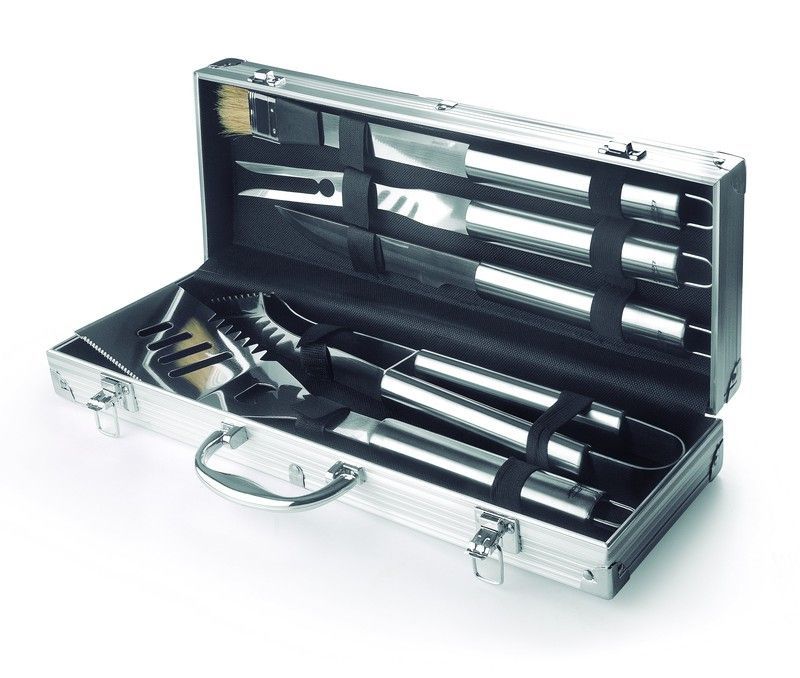 Maletín de barbacoa Lacor de 5 piezas, ideal para amantes de la cocina al aire libre. Fabricado en acero inoxidable de alta calidad con mangos ergonómicos y acabado plateado. Incluye pinzas, espátula, tenedor, cepillo y cuchillo, todo organizado en un elegante maletín de aluminio con cierre seguro. Perfecto para barbacoas, parrillas y eventos al ai