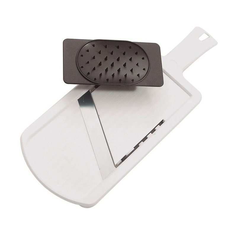 Mandolina ajustable Fackelmann ideal para cortar verduras, frutas y quesos con precisión. Fabricada con base de plástico blanco resistente y cuchilla de acero inoxidable, incluye tapón negro con perforaciones para mayor seguridad. Ajustable para diferentes grosores, perfecta para cocineros caseros y profesionales que buscan eficiencia y seguridad e