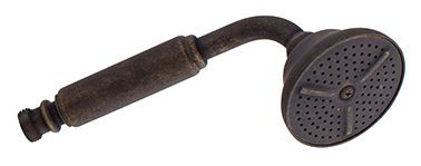 Mango de ducha con diseño clásico y acabado en latón forjadoCabezal circular con múltiples orificios para el chorro de aguaConexión giratoria en el extremo del mangoTextura rugosa y acabado antiguo que simula envejecimiento